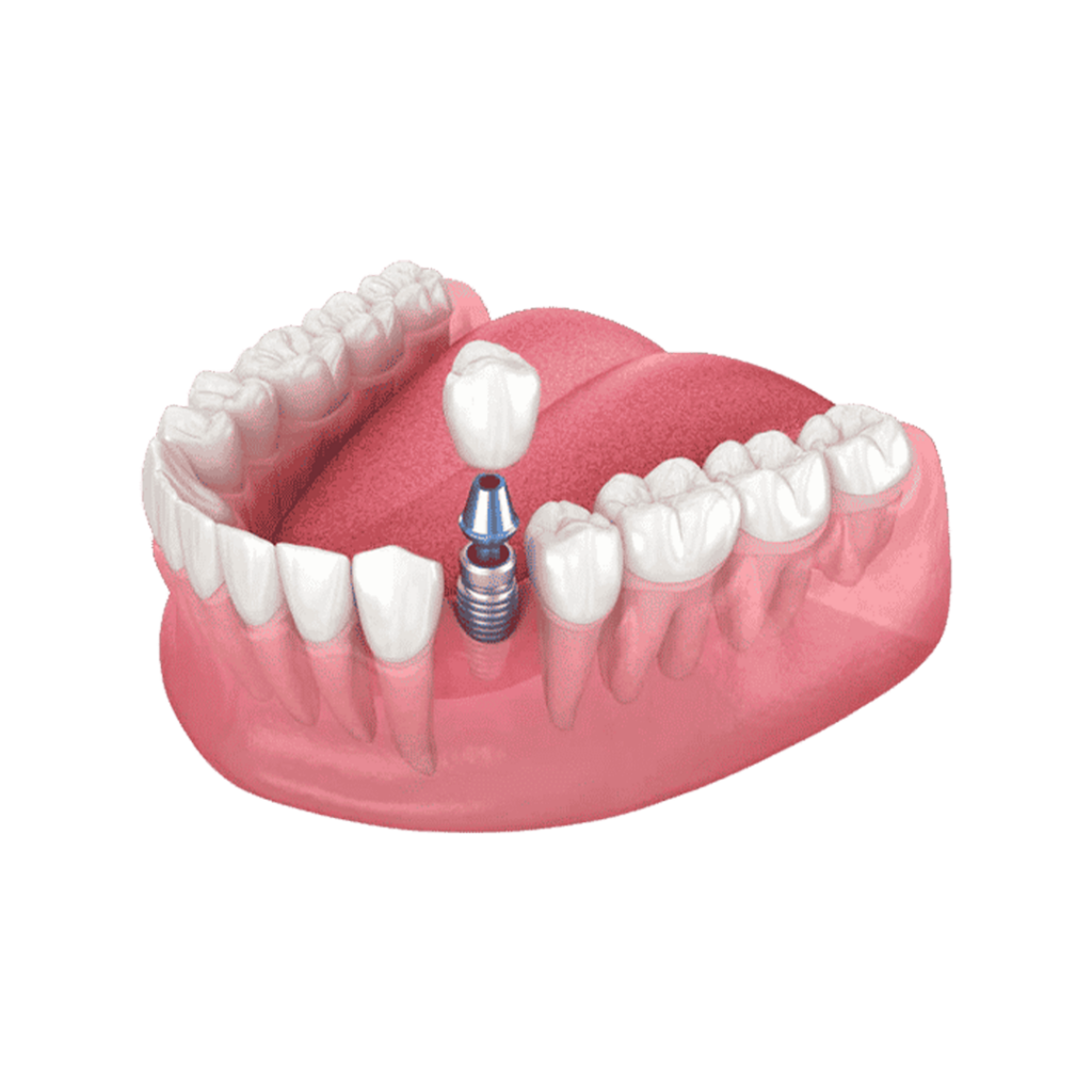 O implante dentário é como uma raiz artificial que colocamos no lugar do dente perdido. Depois disso, colocamos um novo dente fixo por cima, que fica bonito, firme e parece natural.